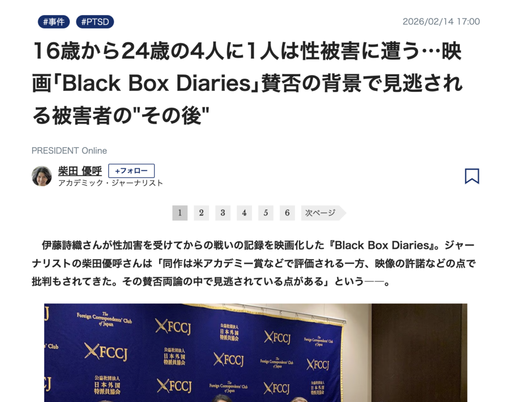 「16歳から24歳の4人に1人は性被害に遭う…映画『Black Box Diaries』賛否の背景で見逃される被害者の”その後”」 (プレジデントオンライン 2026年2月14日掲載)にて、当センター代表理事の長江美代子のコメントが掲載されました。